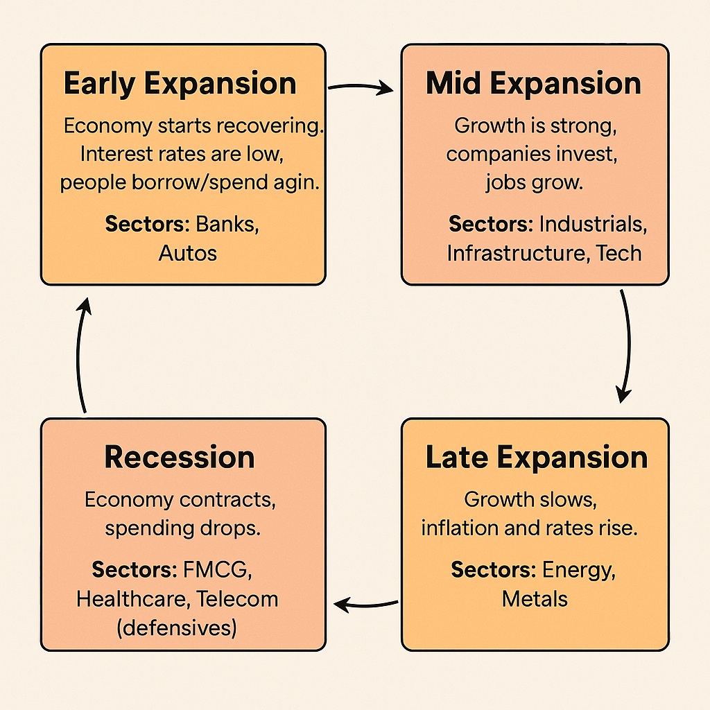 - Later, during late expansion: Rising inflation and rates fuel energy and metals.